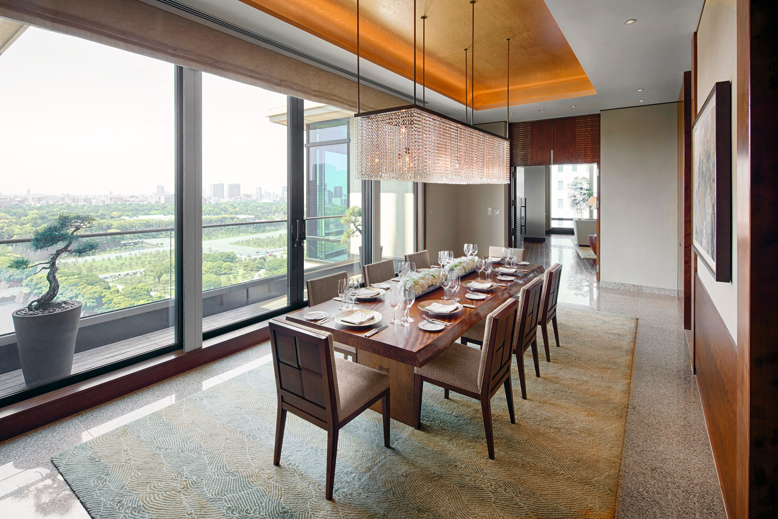 Guests can relax on the sun-drenched private balcony of The Peninsula Suite, while appreciating the most spectacular views. Styled throughout in contemporary Japanese minimalism, the palatial suite offers a contemporary dining room with its own pantry, a private tea ceremony Tatami area, a private gym, study, grand piano, and more.