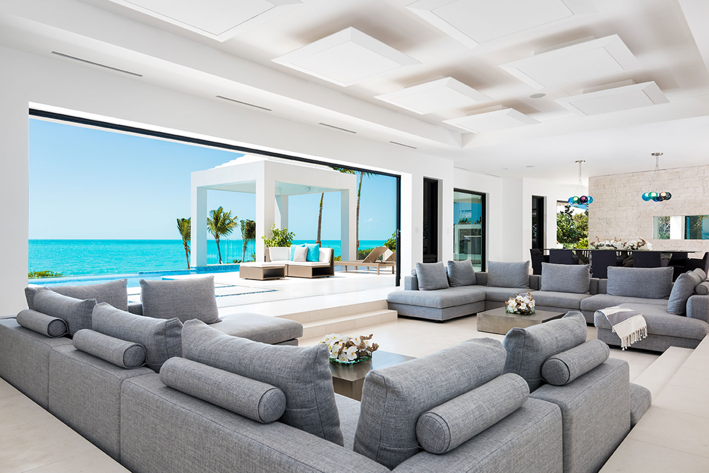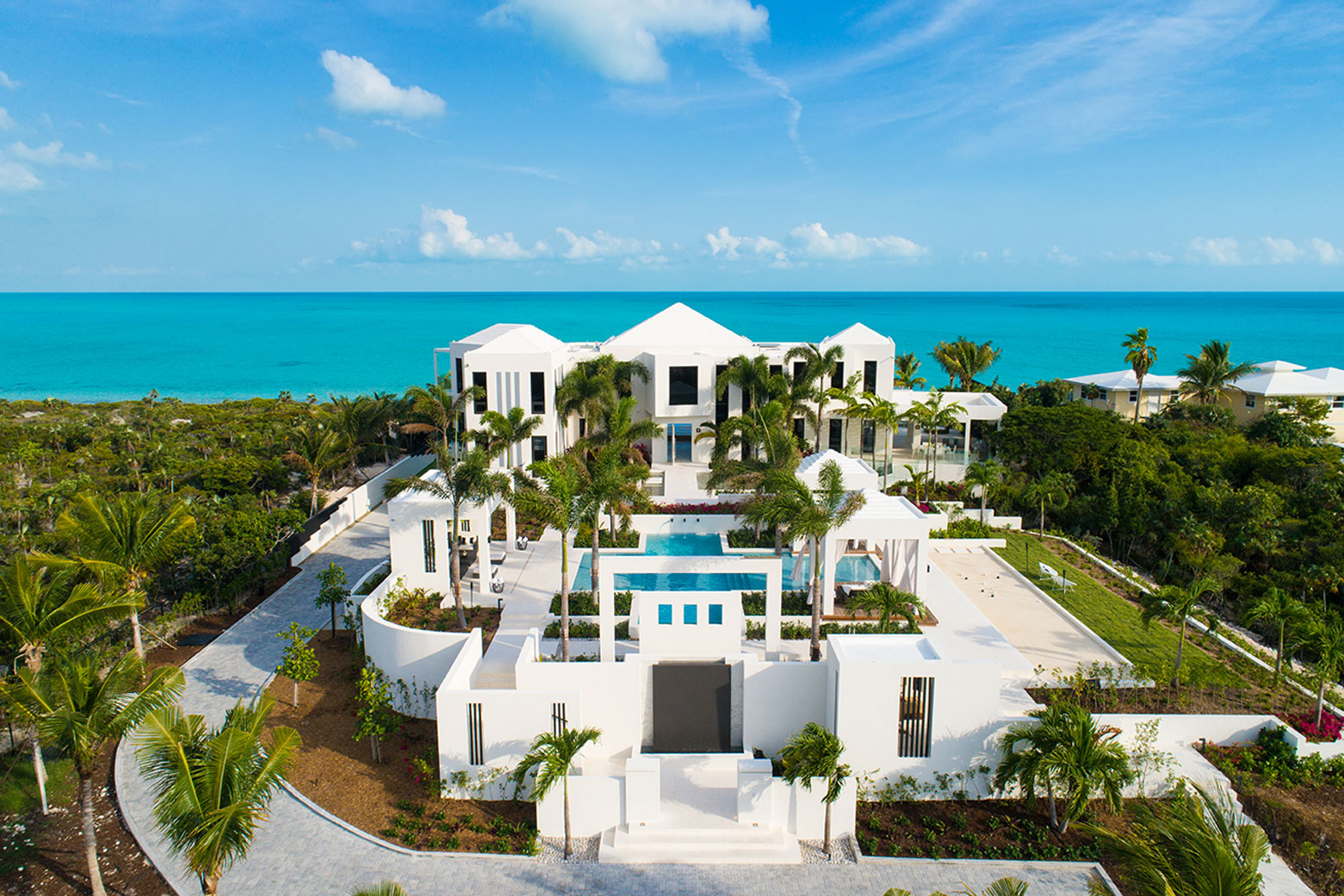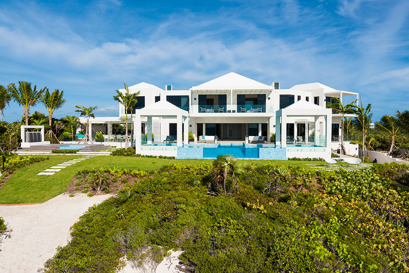Triton Luxury Villas is a fully-staffed seven-bedroom vacation home featuring modern architecture and design, expansive landscaped grounds and two heated swimming pools including an ocean-facing glass-front pool and hot tub. Additional facilities include an outdoor cinema, gym, private tennis court and bocce court