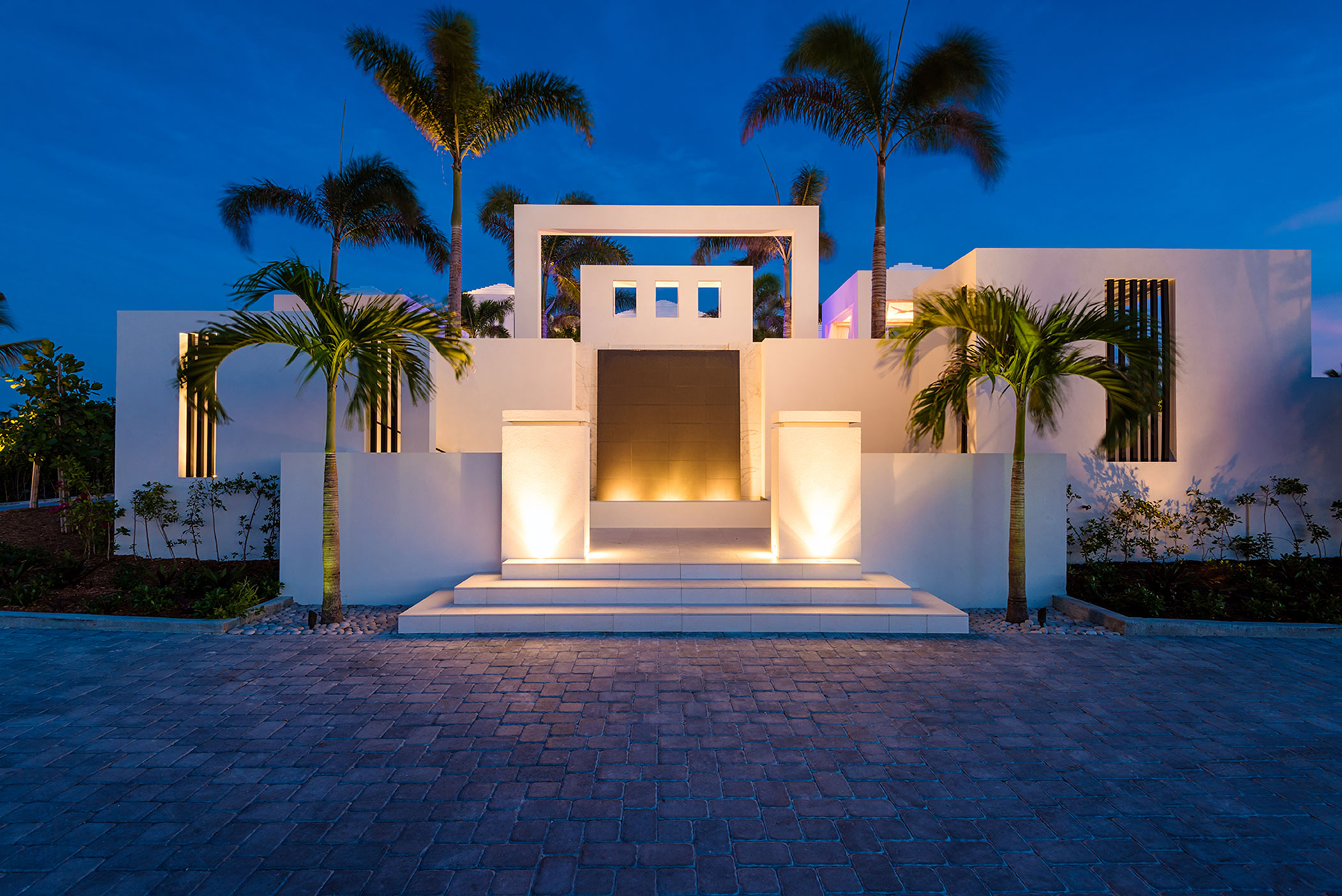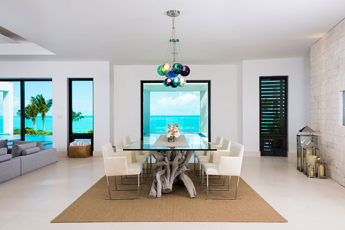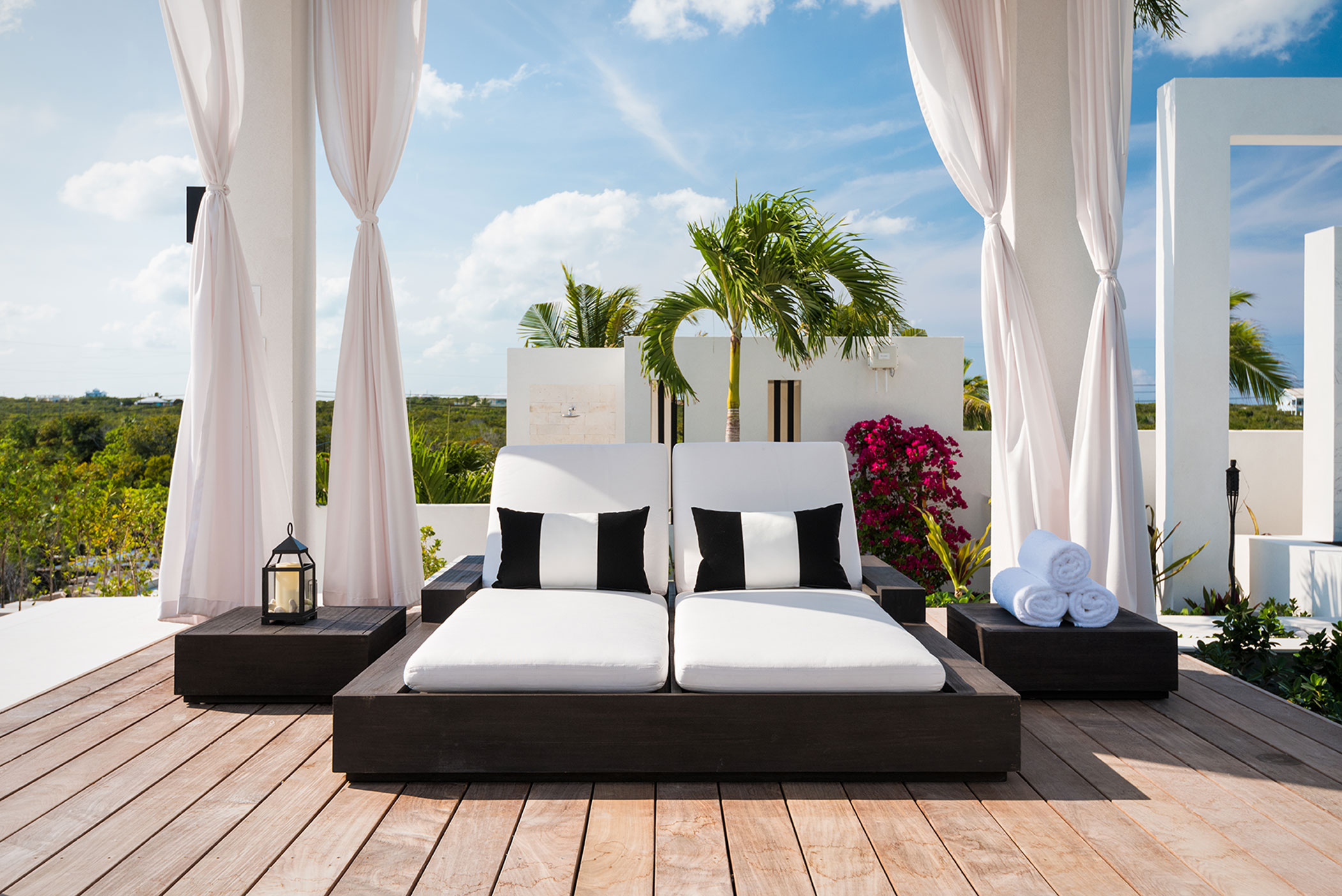 Triton Luxury Villas is a fully-staffed seven-bedroom vacation home featuring modern architecture and design, expansive landscaped grounds and two heated swimming pools including an ocean-facing glass-front pool and hot tub. Additional facilities include an outdoor cinema, gym, private tennis court and bocce court